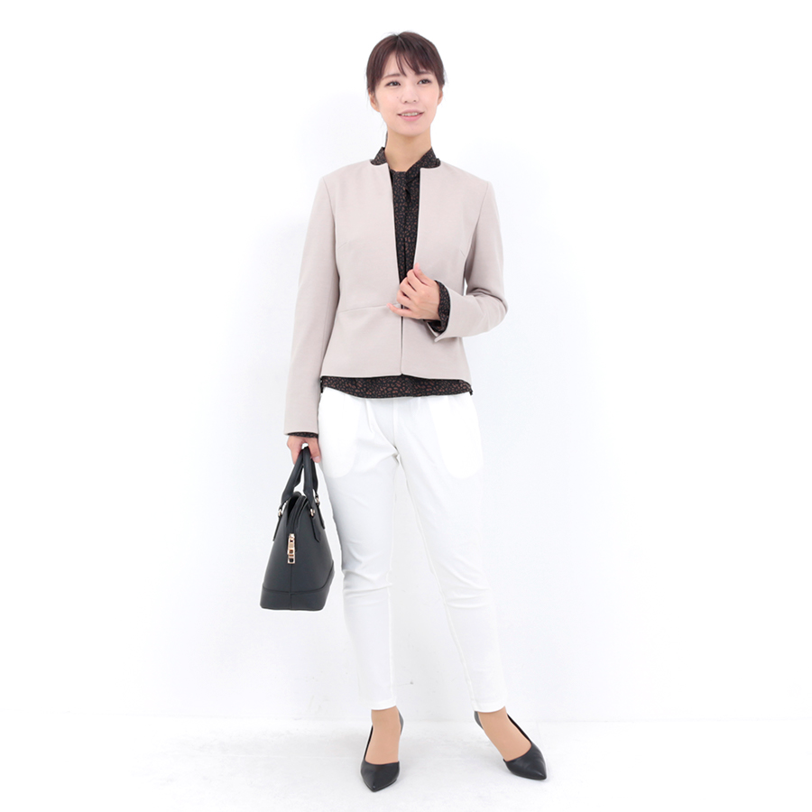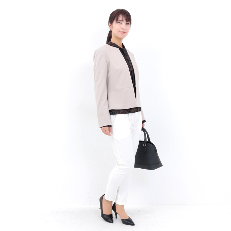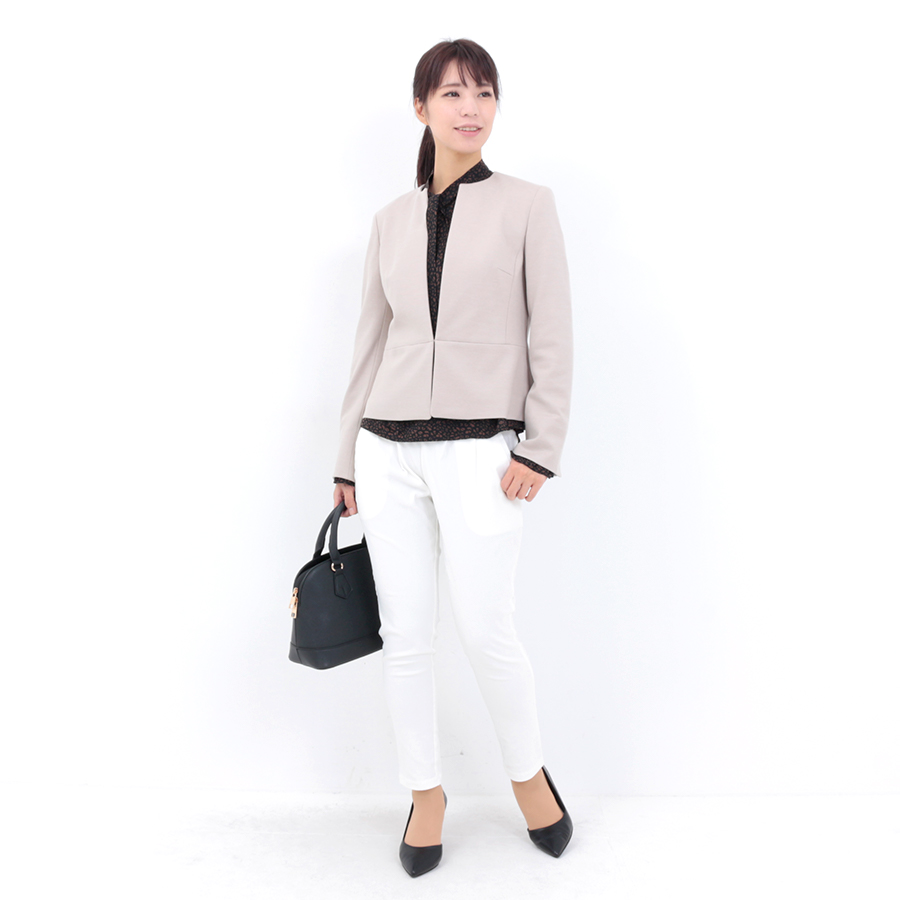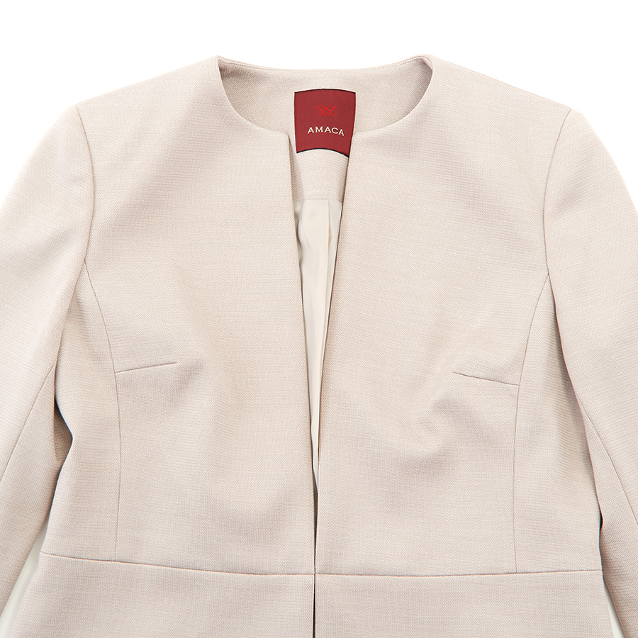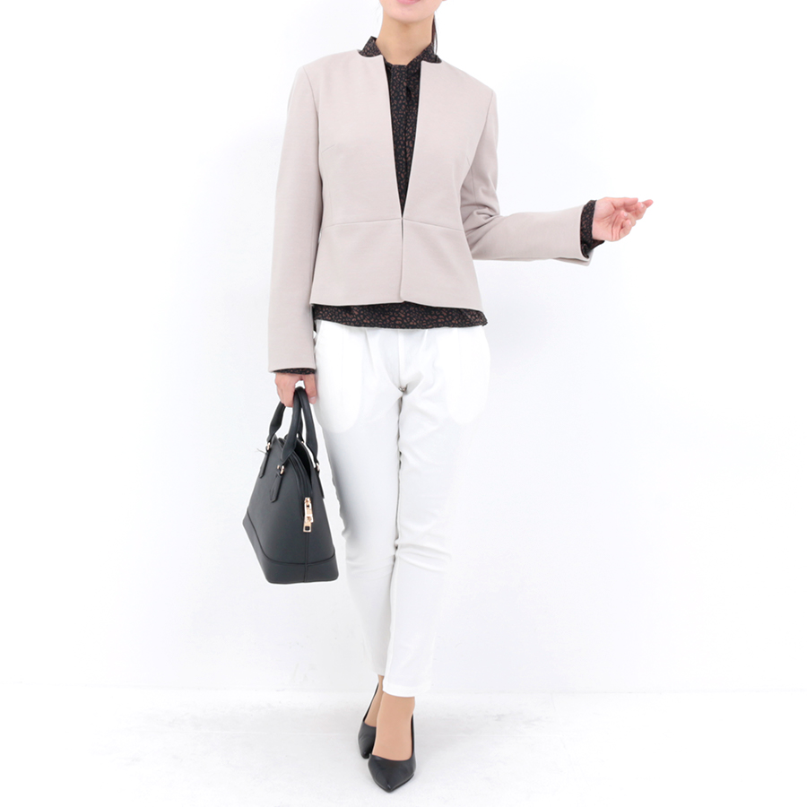 ビジネスシーン活躍する美シルエットのノーカラージャケット。