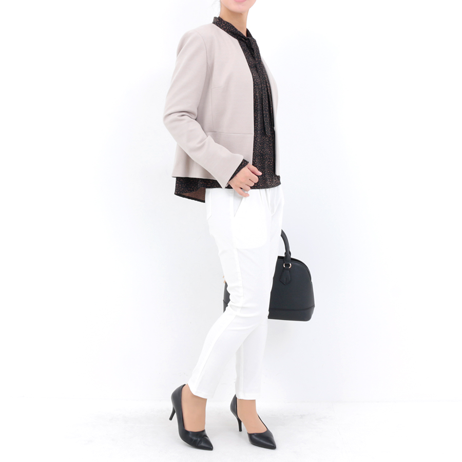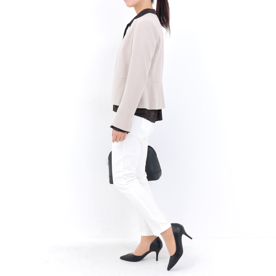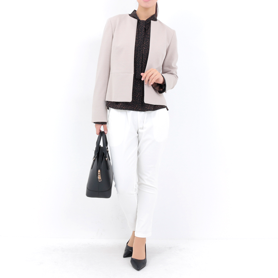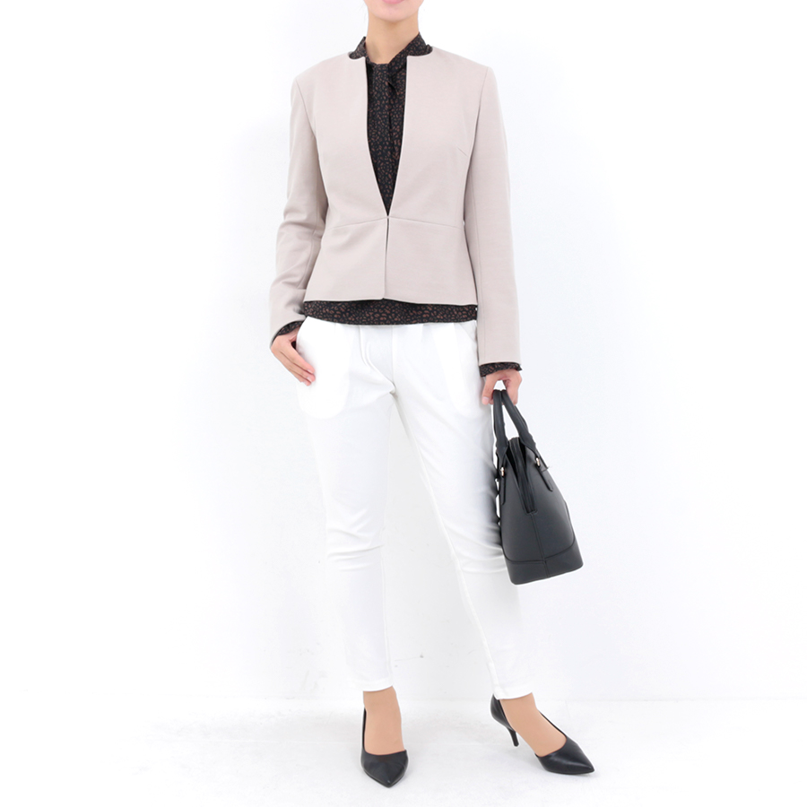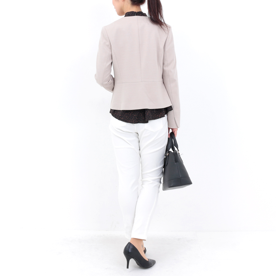 ビジネスシーン活躍する美シルエットのノーカラージャケット。