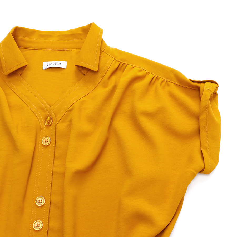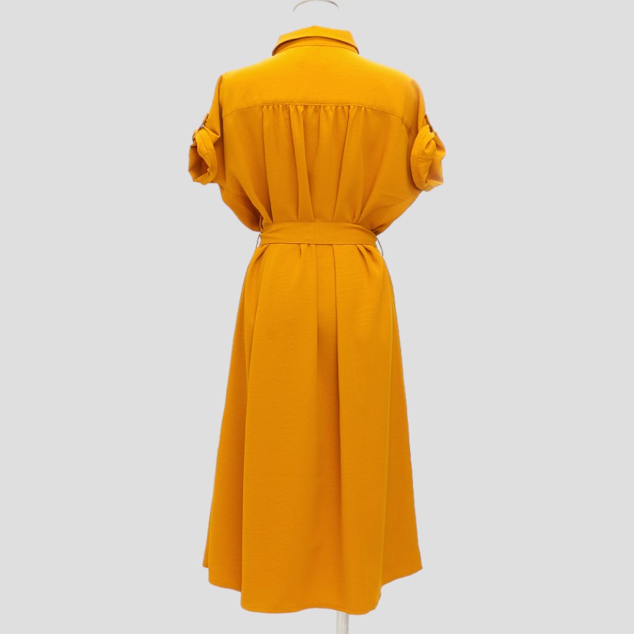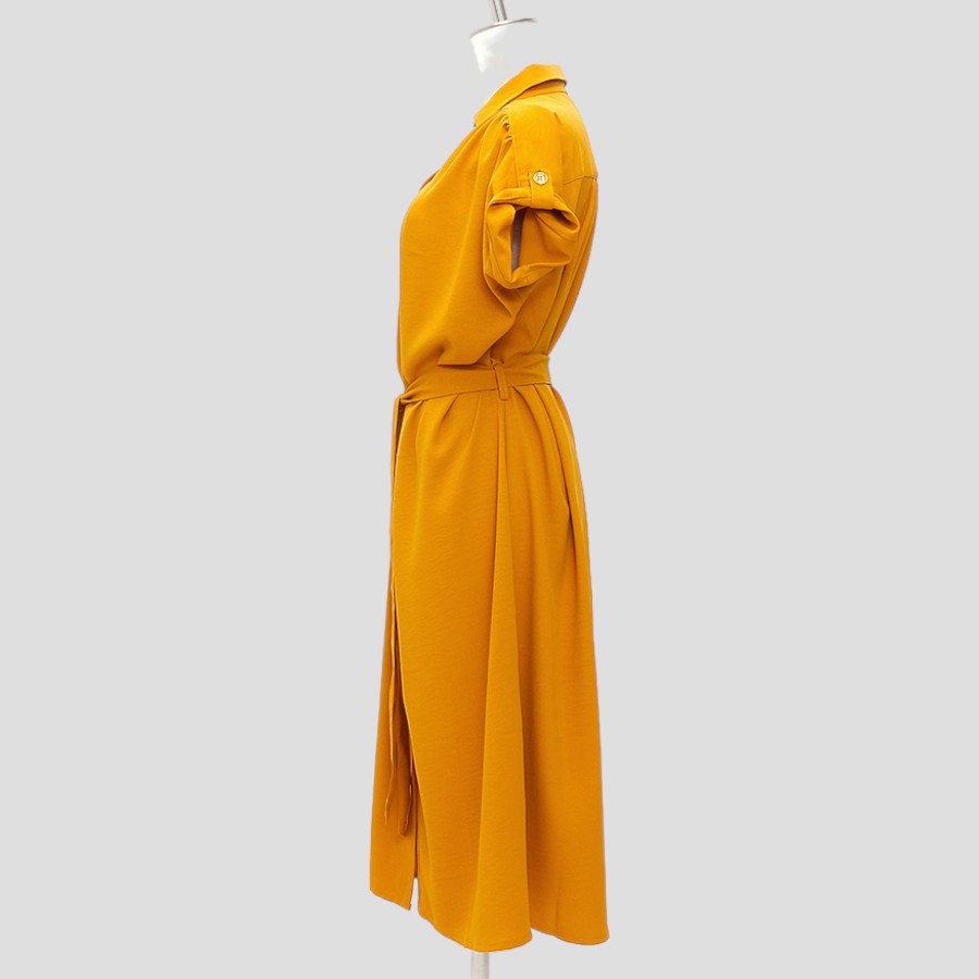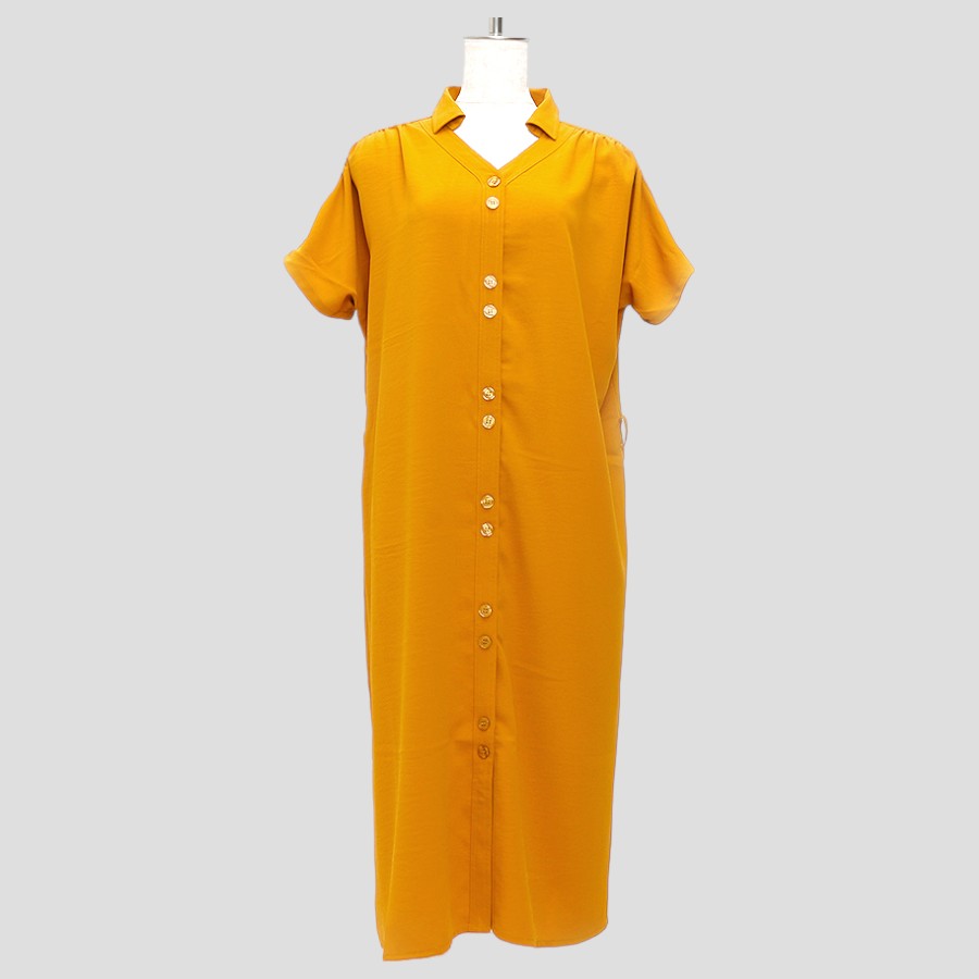★スタッフコメント★フロントのダブルボタンがポイントのワンピース。肌なじみの良い黄色が、明るい印象を与えてくれます。スキッパー衿が抜け感をプラス。落ち感のある滑らかな生地で、着心地は軽やか。袖口のタブを使ってロールアップにしてもお楽しみいただけます。オンオフ問わずご利用いただけます。