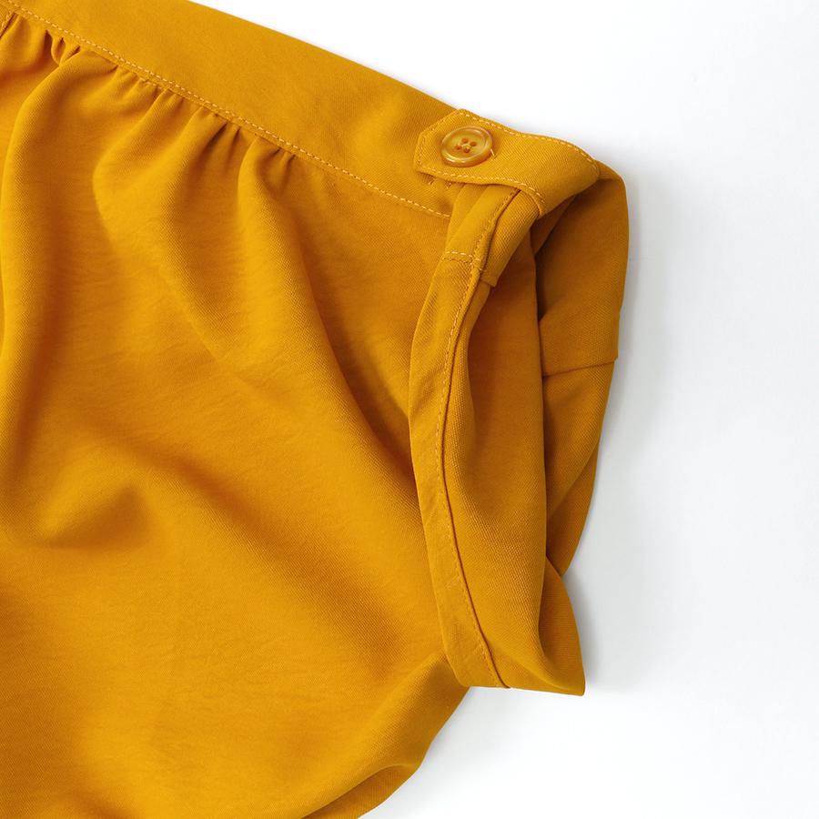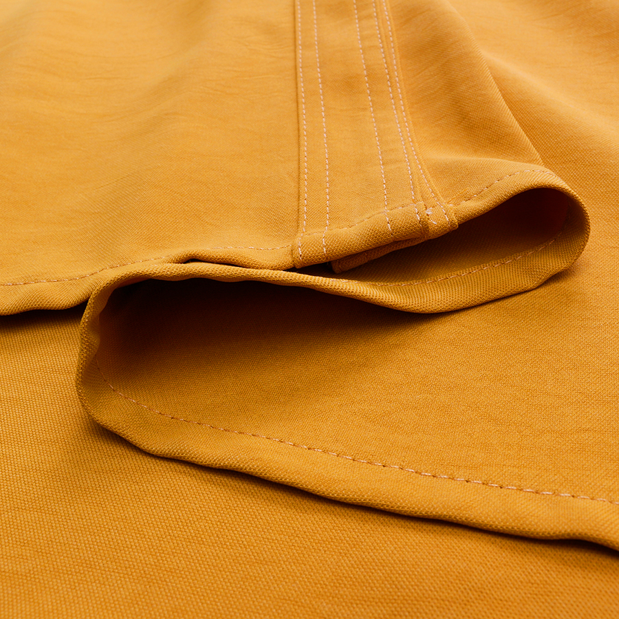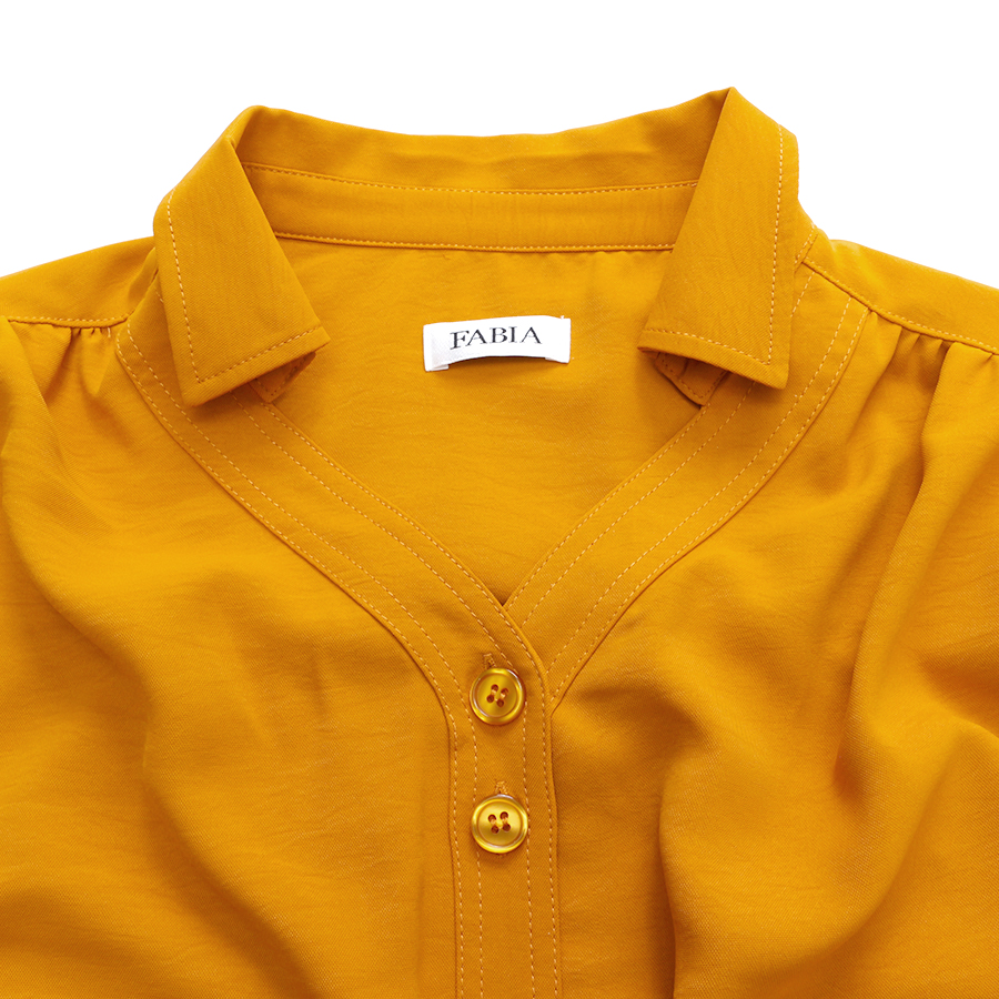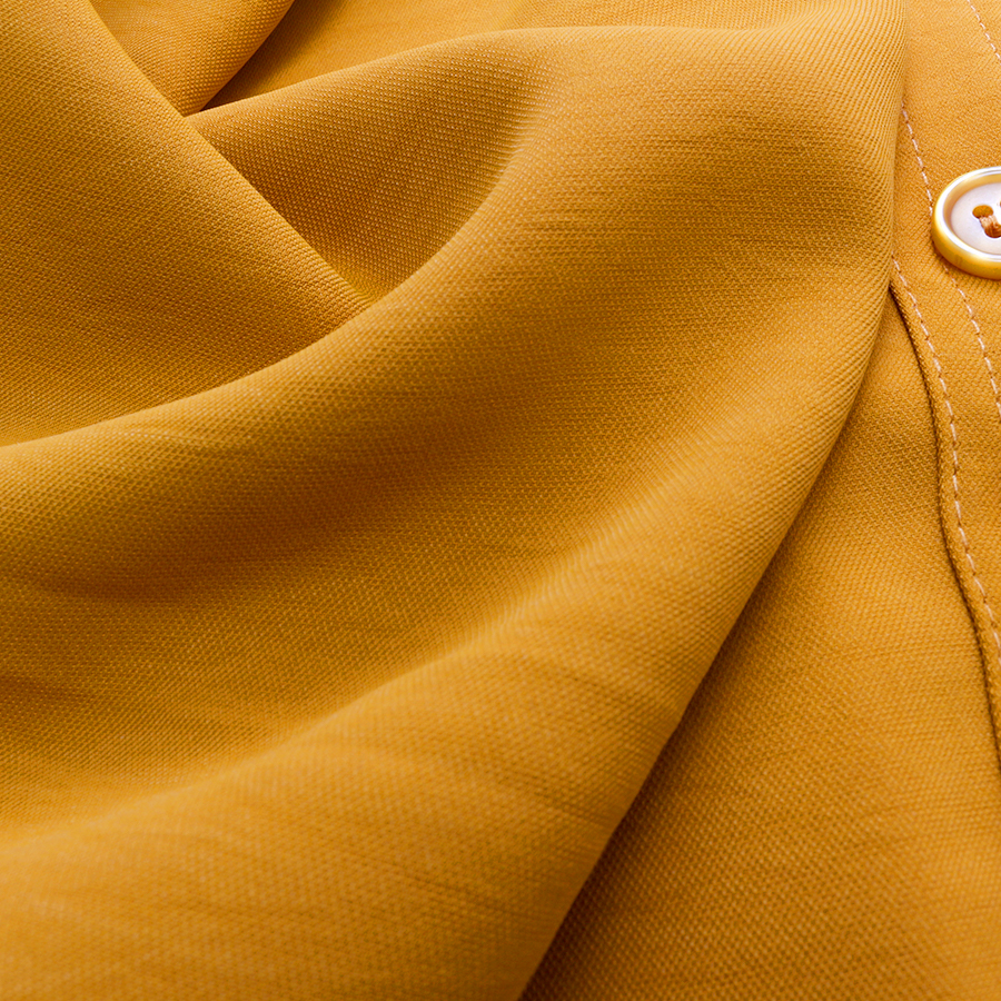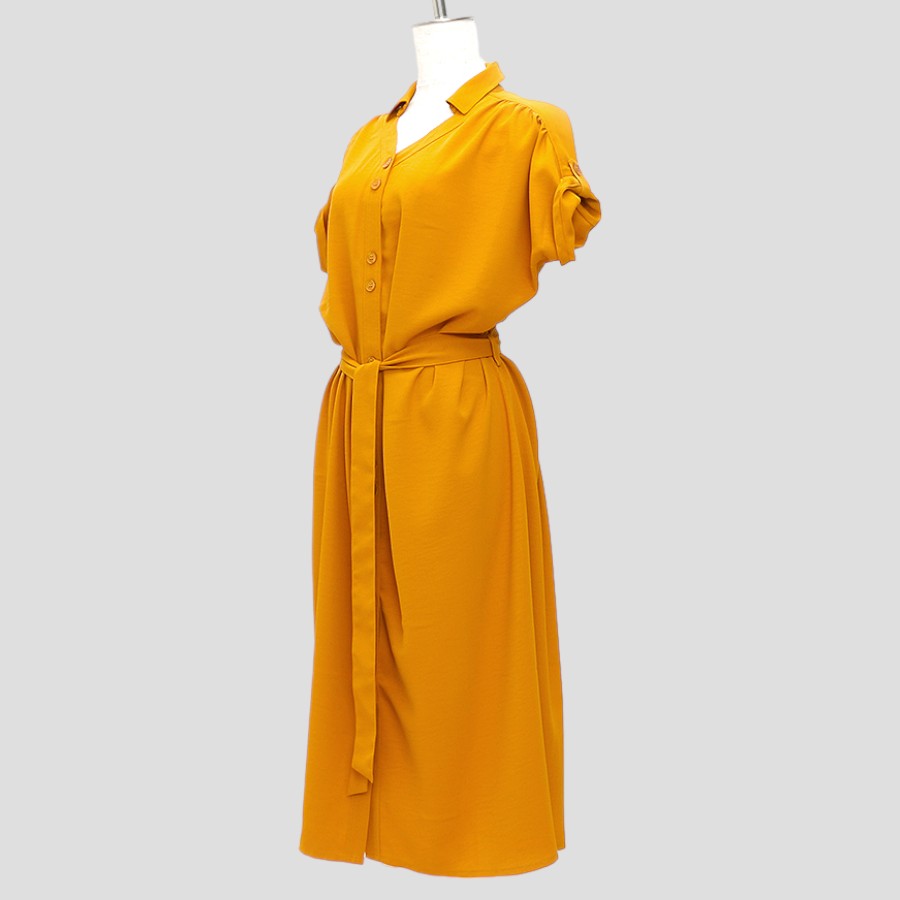 ★スタッフコメント★フロントのダブルボタンがポイントのワンピース。肌なじみの良い黄色が、明るい印象を与えてくれます。スキッパー衿が抜け感をプラス。落ち感のある滑らかな生地で、着心地は軽やか。袖口のタブを使ってロールアップにしてもお楽しみいただけます。オンオフ問わずご利用いただけます。
