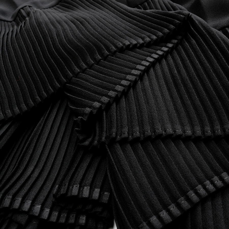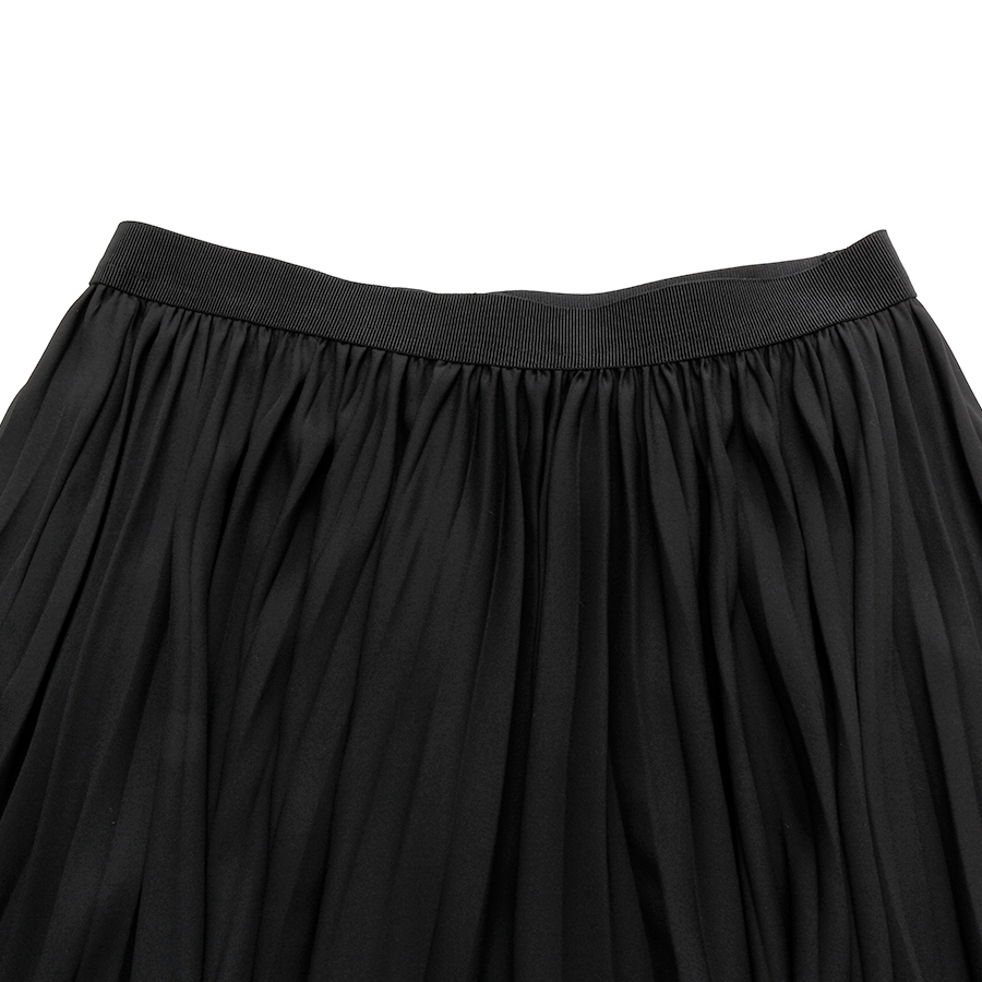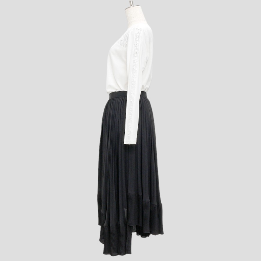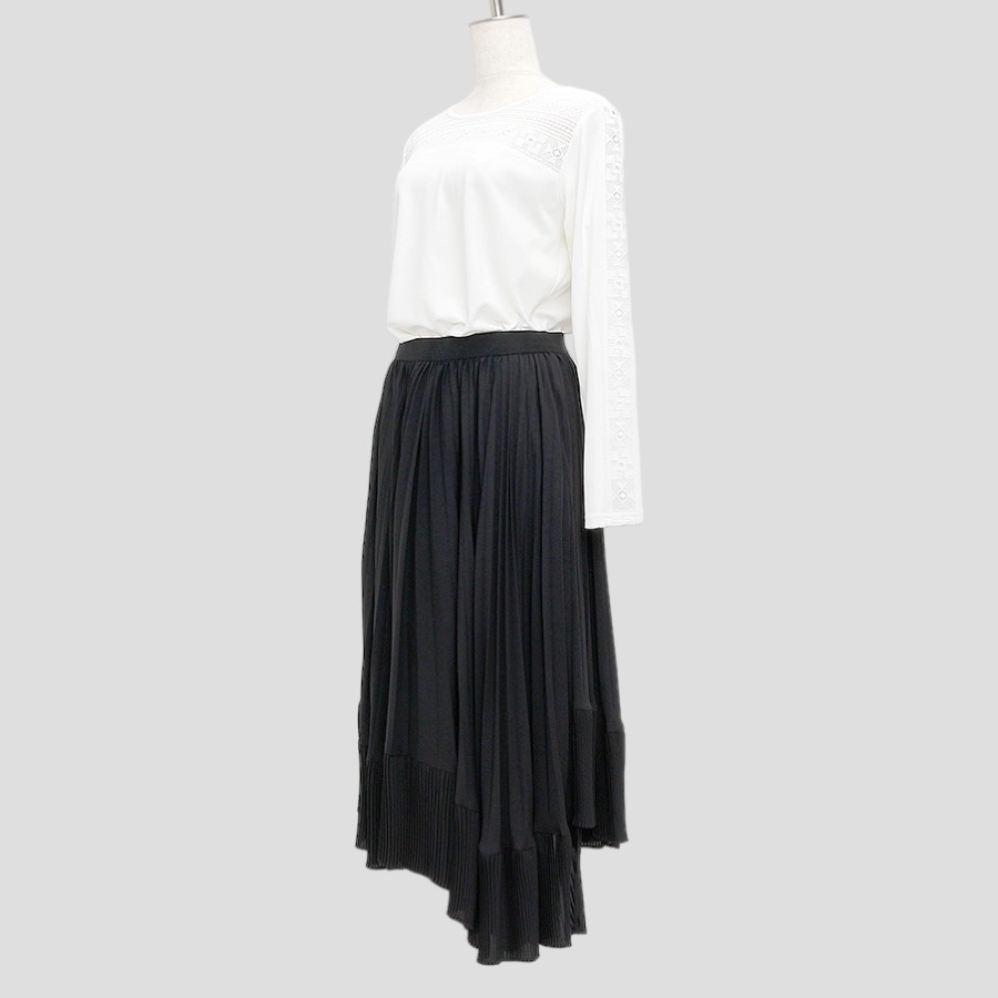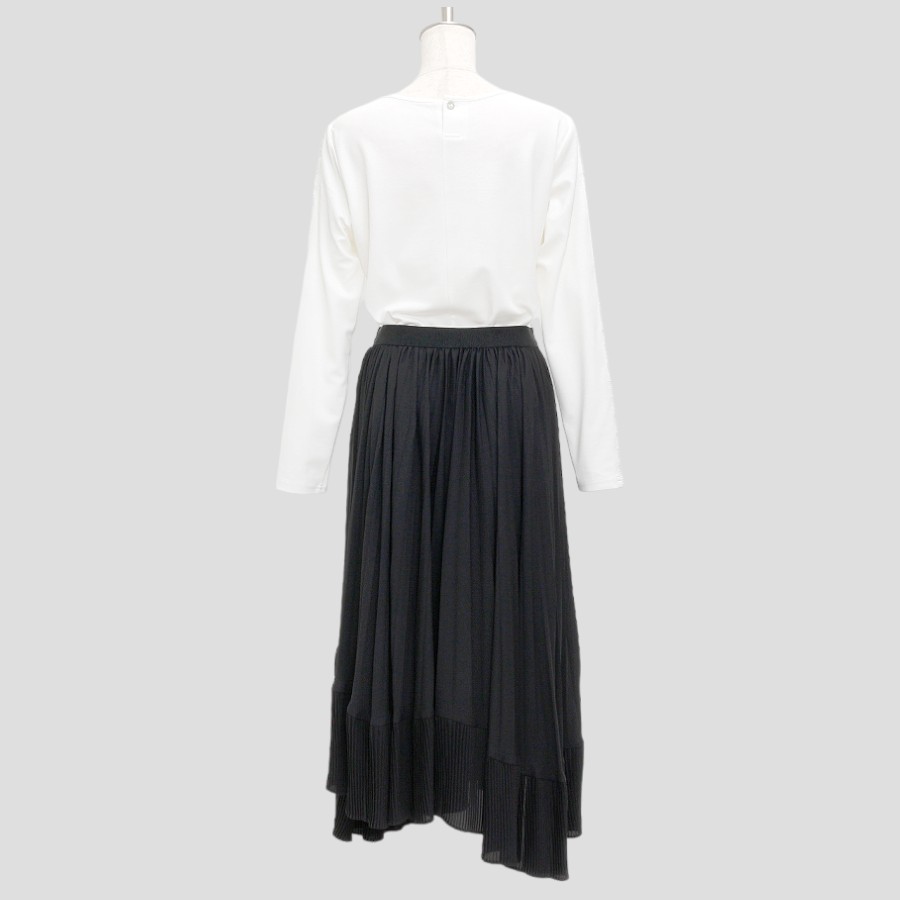 スカートは細かなプリーツとなっていて、特徴あるイレギュラーヘムがおしゃれ。