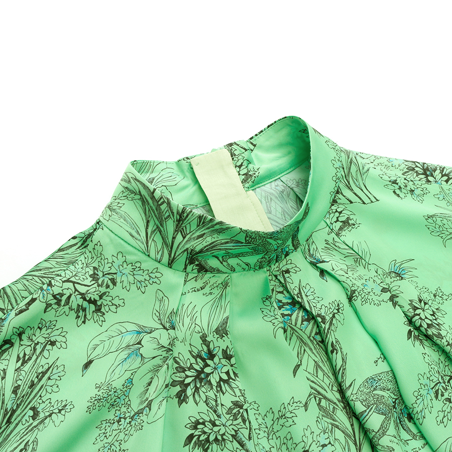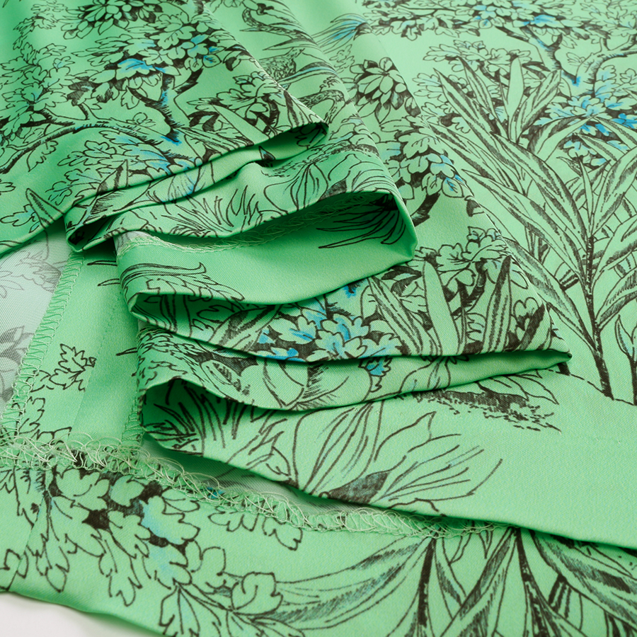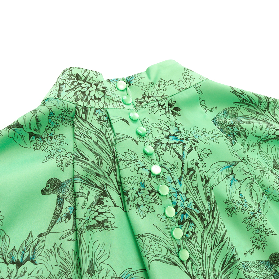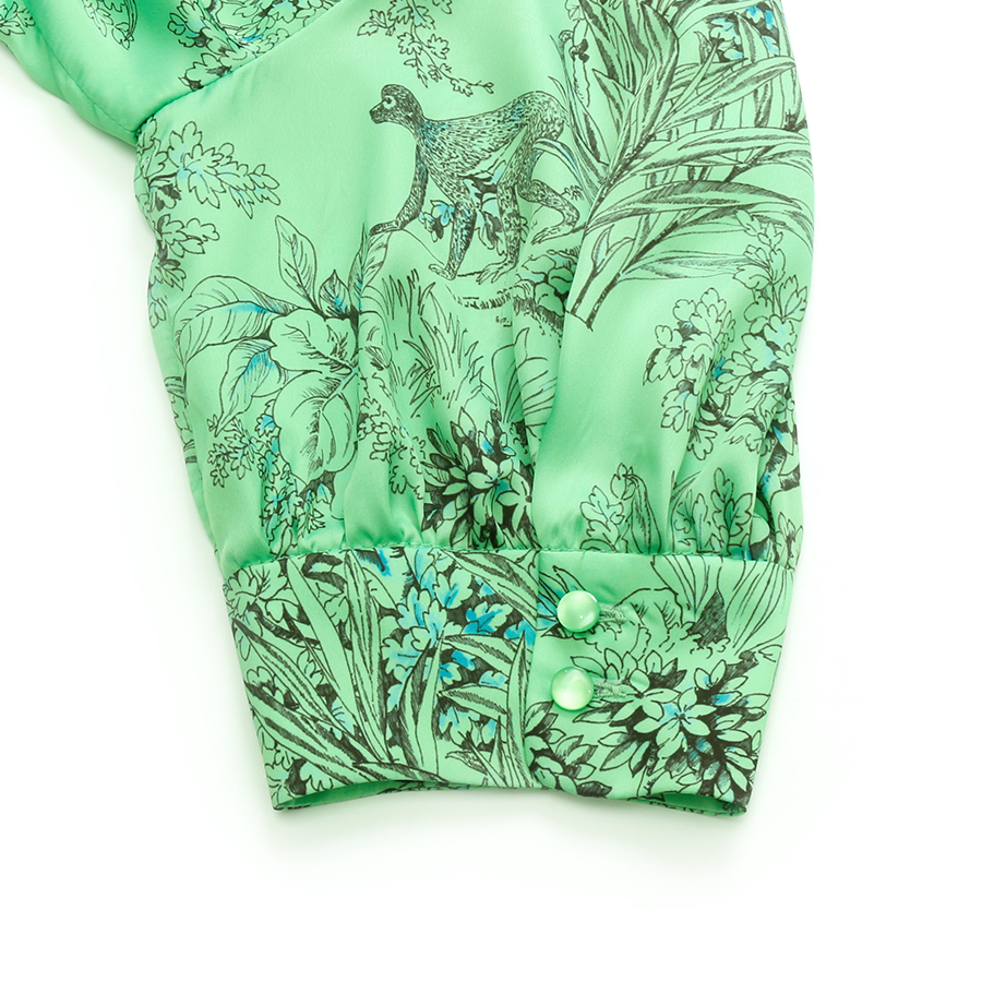 目の覚めるような鮮やかなグリーンで、動物や自然のプリントも可愛いです♪ 布地はさらりとして着心地も良いです。