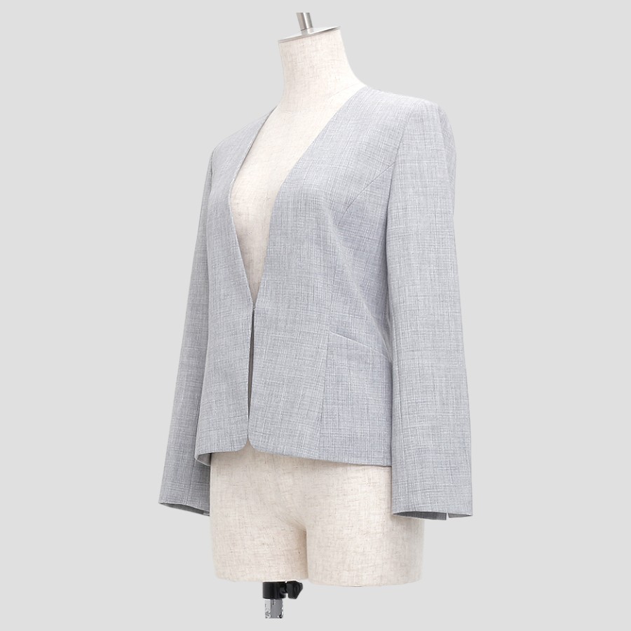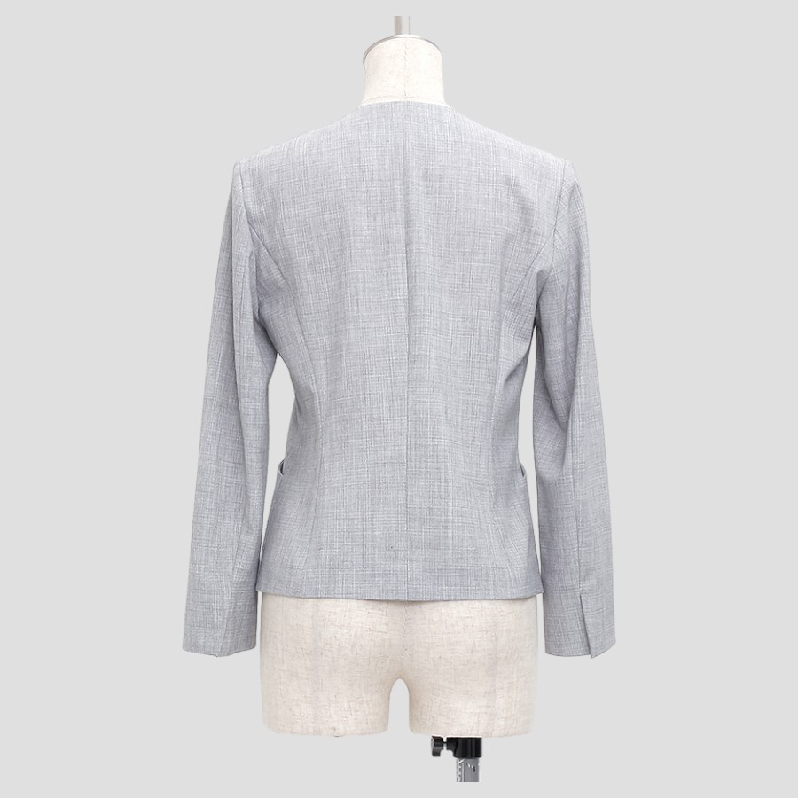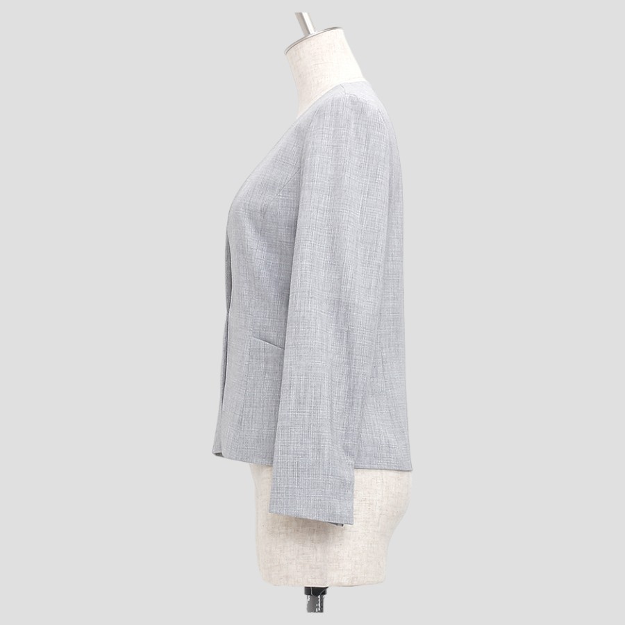 ★スタッフコメント★サマーメランジ生地を用いたノーカラージャケット。サラッとした着心地で暑い季節にも快適に着用して頂けます。軽い素材感となっており、前身頃のみ裏地がついております。きちんと感のあるデザインでオンオフ問わずご活用頂けます。 ※色違い・サイズ違いはこちら(2398-00003)もご覧ください。