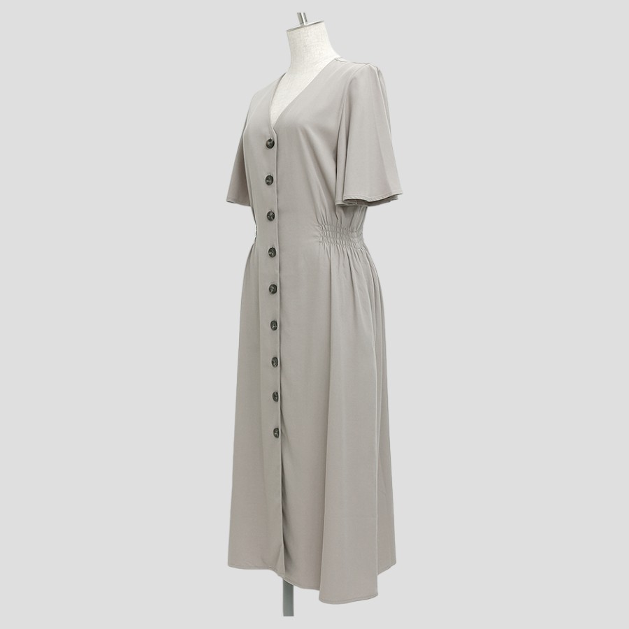 胸元は大きめに開いたデザインで、ワンピースとしてはもちろん、フロントボタンを開けて羽織としてもご活用いただけます。