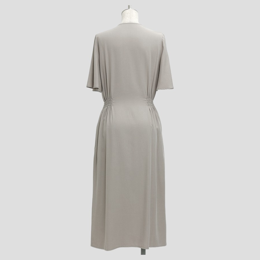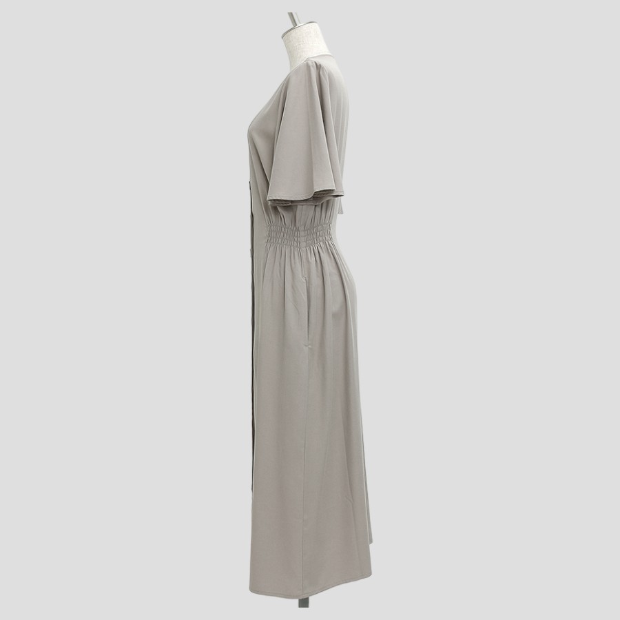 ゆったりとしたフレアスリーブとウエストのシャーリングが特徴のワンピース。