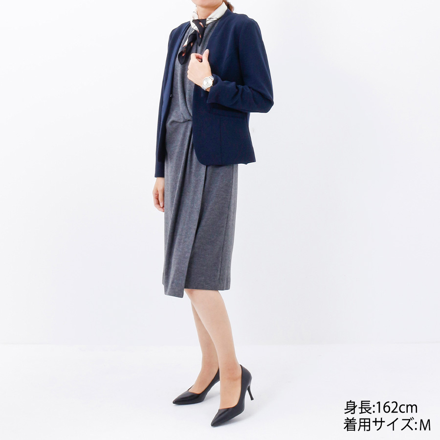 胸元から流れるようなドレープが入り女性らしく上品な印象に。