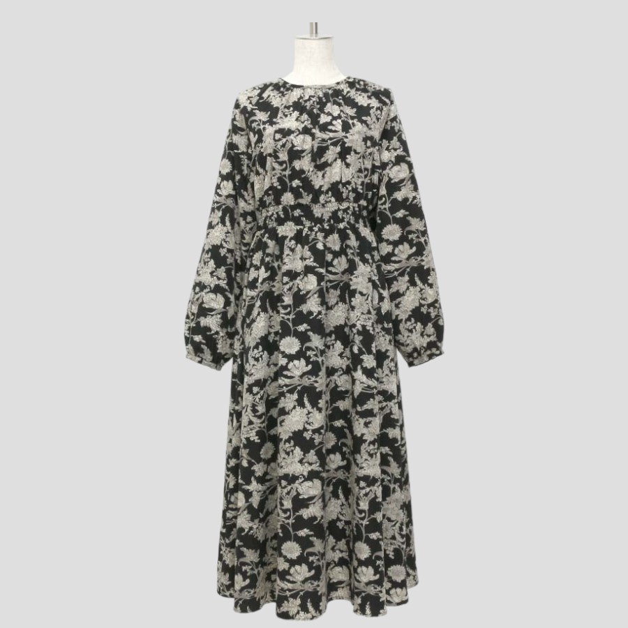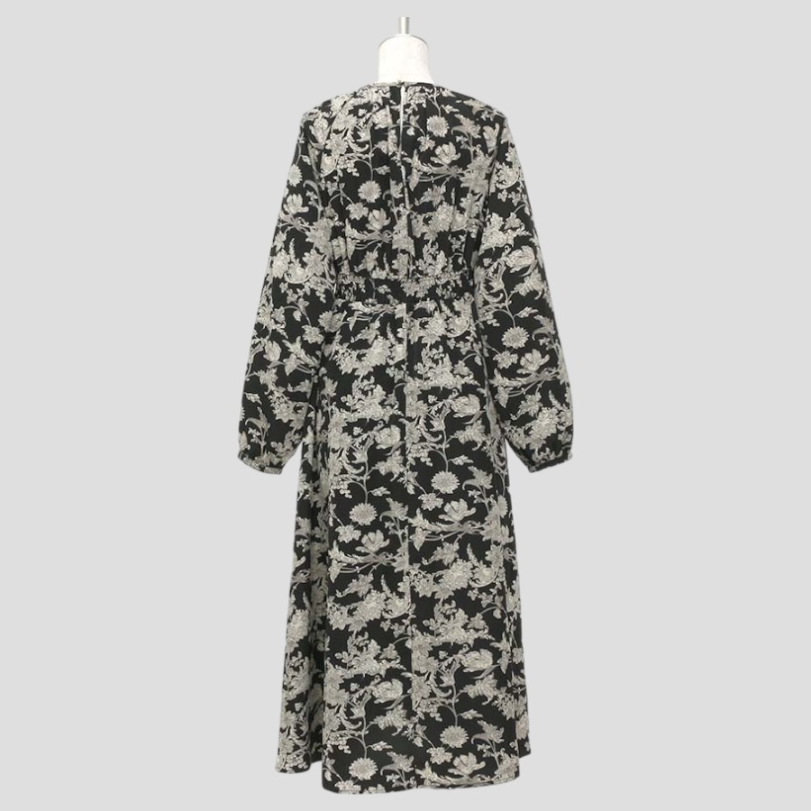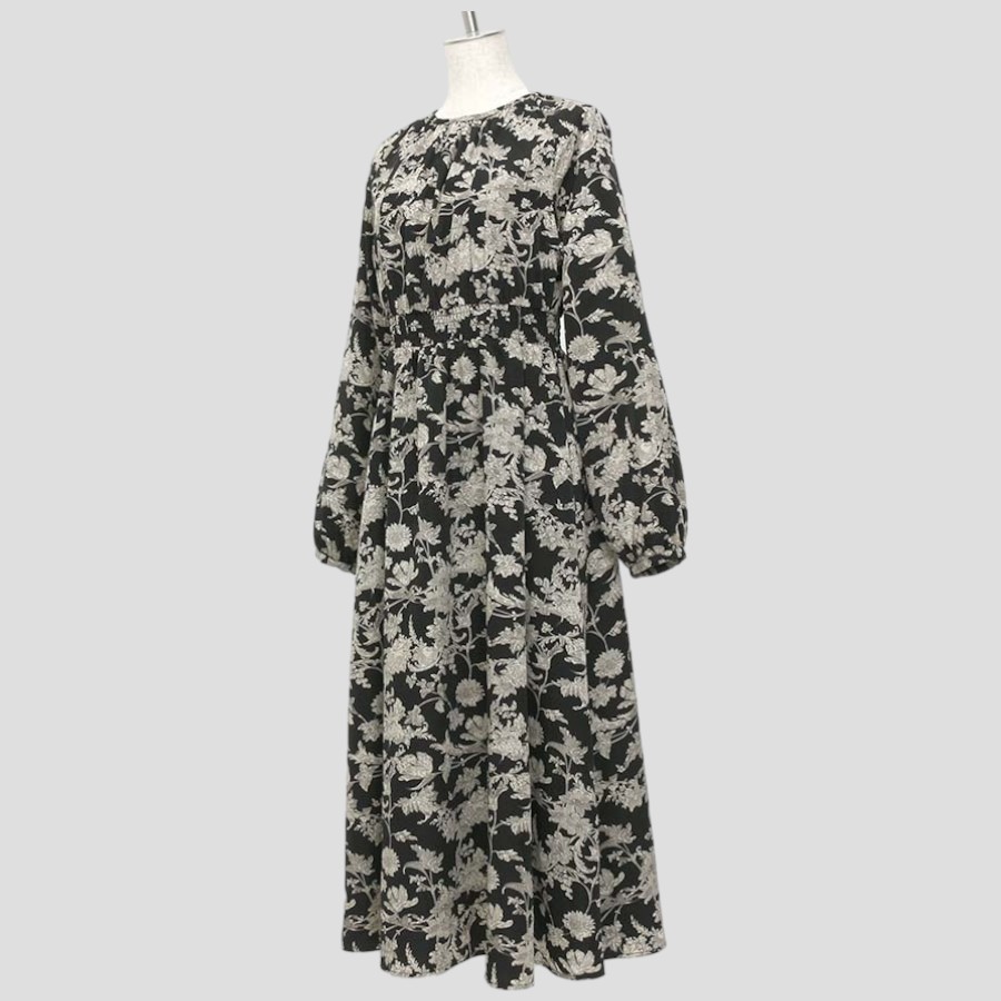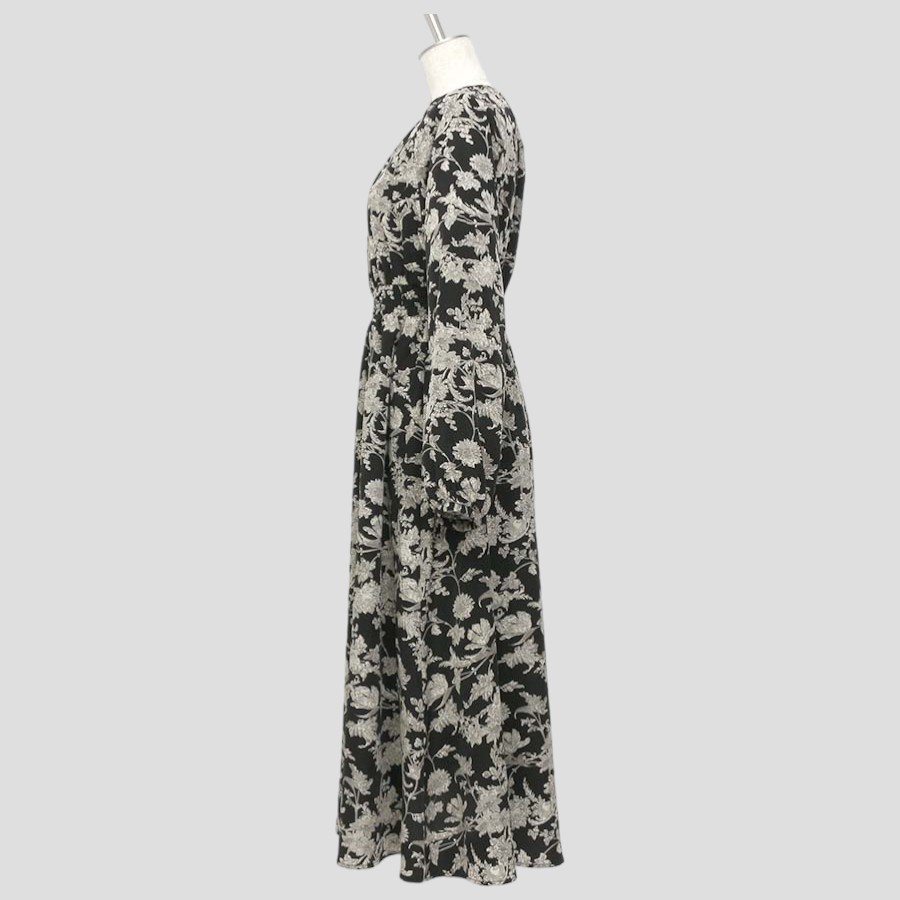 ★スタッフコメント★フラワープリントの長袖ワンピース。シックな配色で落ち着いた大人の雰囲気です。ラグラン袖で肩回りが動かしやすいデザイン。ウエスト部分は切替があり総ゴム仕様なので、スタイルにメリハリも。薄手のややハリ感のある素材で軽やかな着心地。スカートのみ裏地がついております。※こちらはかぶりタイプのワンピースです