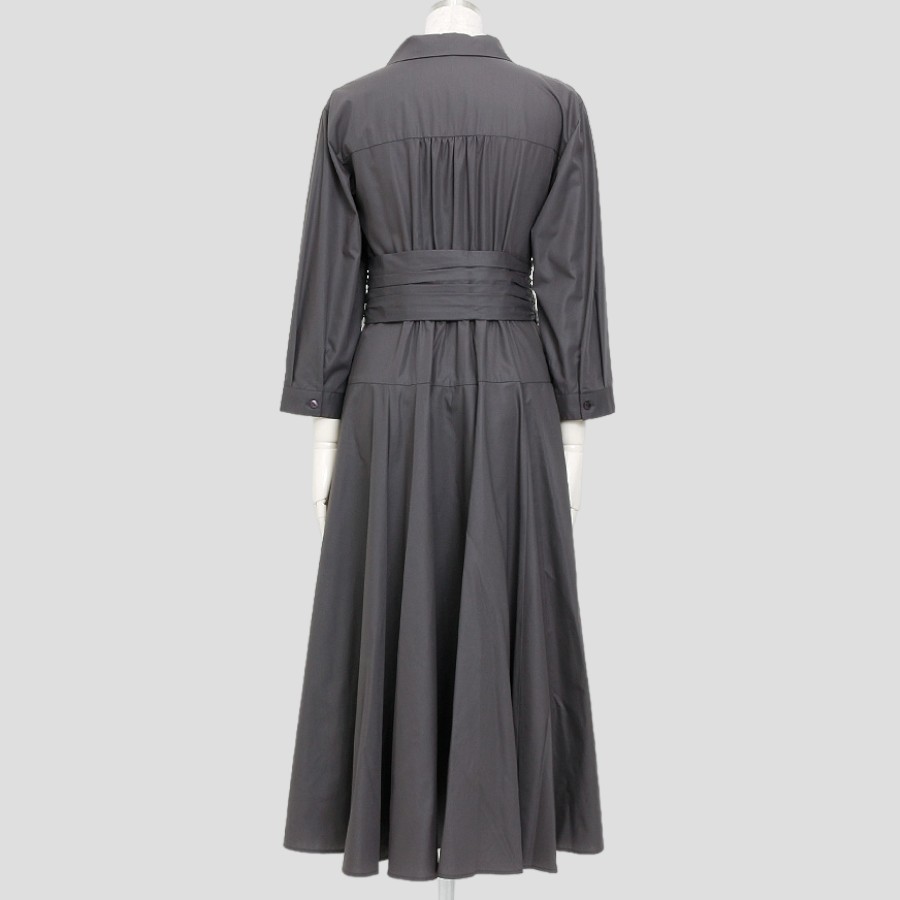 ハリがあって地味すぎないグレーで、ウエストから広がるスカートも長めでとてもエレガントです。ベルトをするとよりスタイルが良く見える気がします。中に薄手のタートルを着てブーツを履くなど様々に楽しめます。