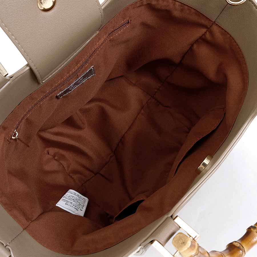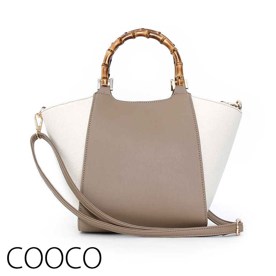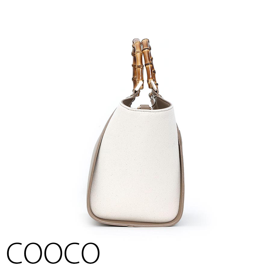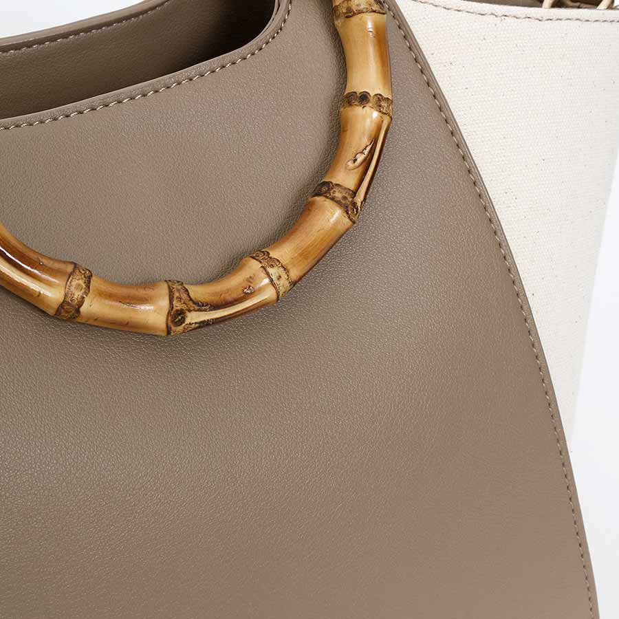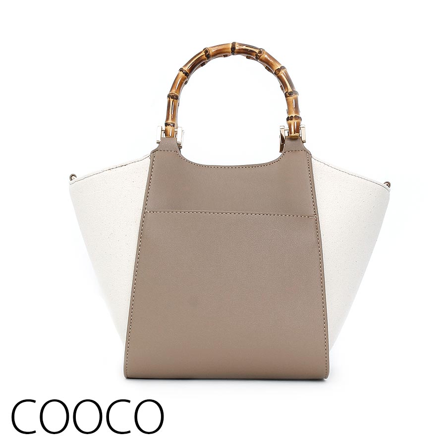 ★スタッフコメント★バンブーハンドルで大人らしさをプラスしたトートバッグ。フェイクレザーとキャンバス地の切り替えデザインで爽やに。コンパクトサイズながらも、長財布や500mlペットボトルも収納できます。通勤からお出掛けまでシーンに合わせた持ち方ができる取り外しショルダー付き。※開閉はマグネット式になっております。