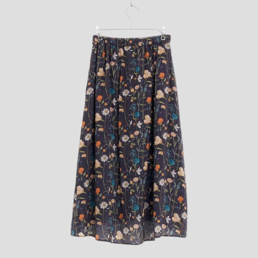 リバティの花柄が可愛らしいスカートです。後ろが少し長めになっていて美しいラインで気に入りました。何度も着用しました。
