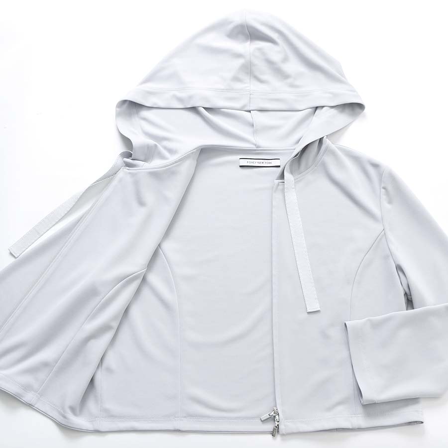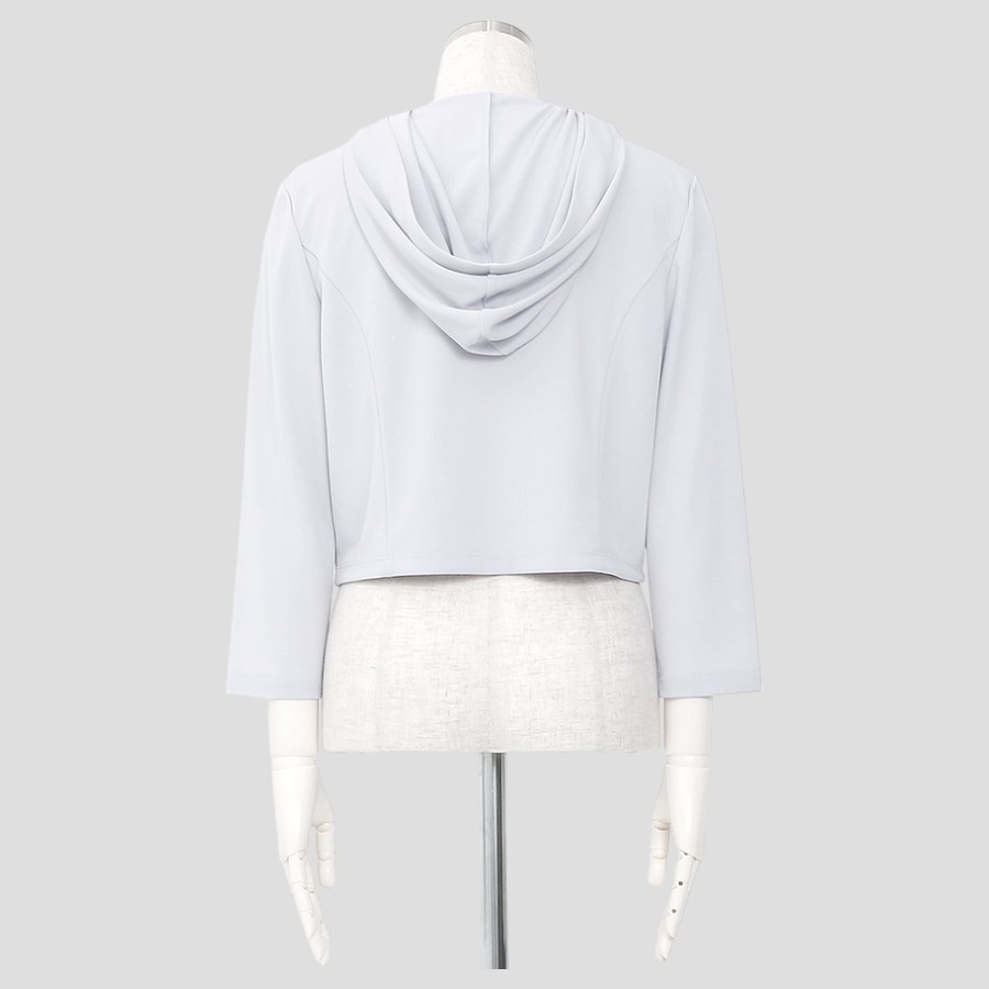 ★スタッフコメント★グログランリボンを使用したショート丈のパーカー。サラッとしたドライな肌触り。7分袖となっています。袖口はリブなしなので、カジュアルになりすぎません。ダブルジッパーの開け方次第でこなれ感のある着こなしも。