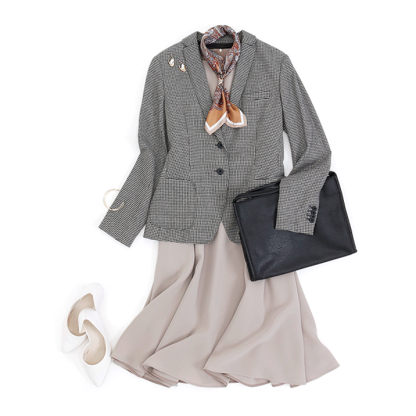 ハウンドトゥース(千鳥格子)のチェック柄はいつものスタイルにプラスするだけでおしゃれな秋スタイルに。トーンを抑えたコーディネートはエレガントな柄のスカーフをアクセントに取り入れてはいかがでしょうか?