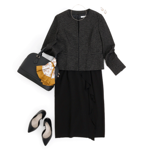 同系色ワンピースを合わせると、大人女性に相応しい品格高い装いに。ワンポイントのスカーフが華やかさをプラスします。
