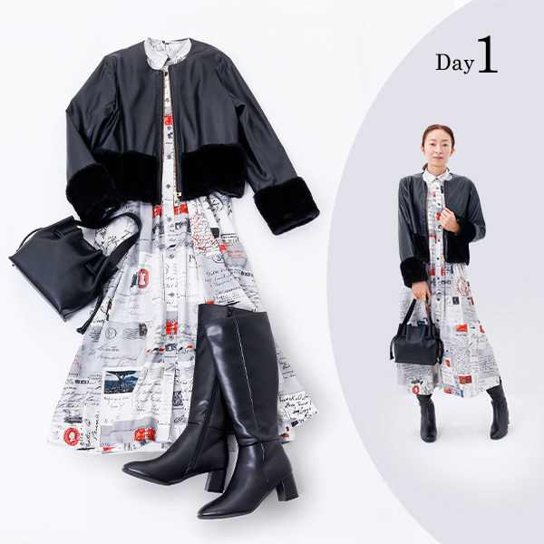 イラストプリントのワンピースが主役の遊び心あるスタイリング。黒のショートジャケットとブーツで引き締めつつ、長時間の移動や観光にも対応できる実用的なコーデに。バッグもしっかりサイズで収納力も確保。