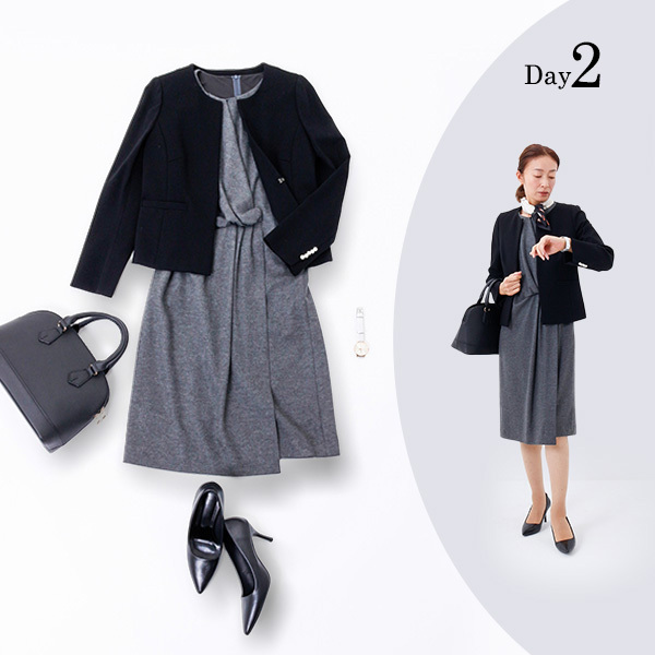 グレーのワンピースに黒のジャケットを合わせた信頼感のある装い。すっきりとしたシルエットでフォーマル感を演出しながら、グレー×黒の王道な組み合わせで好印象をキープ。