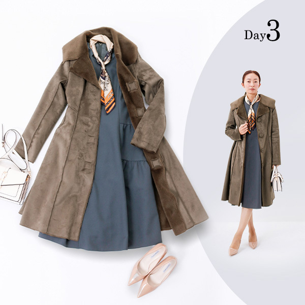 グレーワンピースにベージュのロングコートを合わせた柔らかな雰囲気のコーディネート。パンプスも優しいトーンで統一し、華やかながらも上品な着こなしに。
