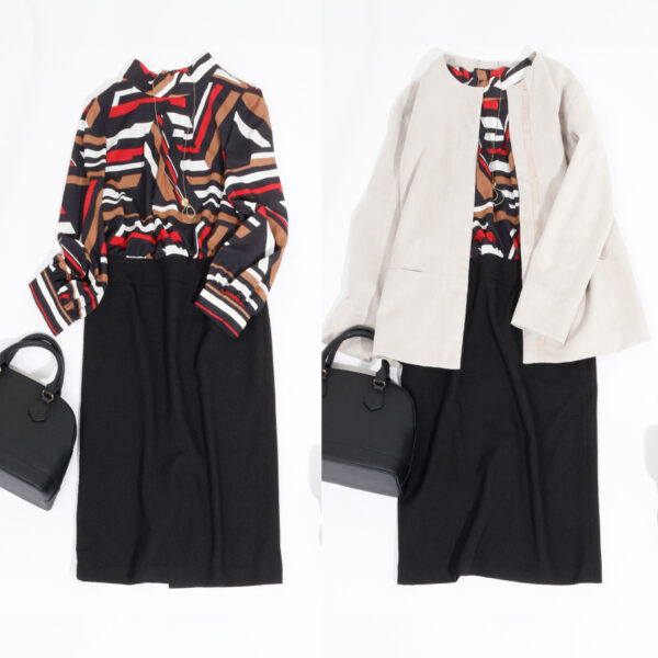 幾何学模様が目を引く切替ワンピースを主役にしたモードなコーディネートには、ベージュのスエードジャケットがベストマッチ。個性的なパターンのワンピースには、アウターをシンプルにすることでバランスよく仕上がります。スエードジャケットを羽織ればクリーンで都会的な印象に、脱げばワンピースの個性的なデザインが際立つスタイリッシュなスタイルに。朝晩の気温差にスマートに対応しながら、大人の女性らしい知的さを演出できます。オフィスカジュアルにもお出かけにも対応できる、頼れるコーディネートです。
