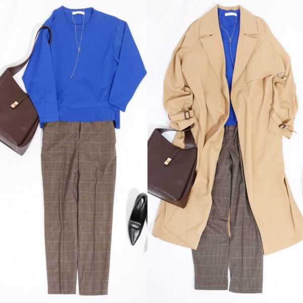 鮮やかなブルーのニットにブラウンチェックのパンツを合わせた知的なコーディネートには、定番のベージュトレンチコートが最適。クラシカルでありながらモダンな印象のこのスタイルを、トレンチコートがより上品に格上げしてくれます。朝晩の冷え込みにはコートでしっかりと寒さをカバーし、日中の暖かい時間帯はニット一枚で軽やかに。ブルーとブラウンの美しい色合わせを活かしながら、寒暖差に対応できる頼れる組み合わせです。