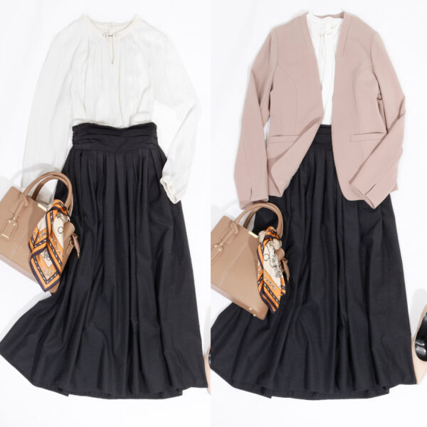 白のブラウスに黒のフレアスカートを合わせた女性らしいコーディネートには、ベージュのノーカラージャケットがぴったり。朝晩の冷え込みにはジャケットを羽織って寒さ対策を、日中の暖かい時間帯には脱いで軽やかに過ごせます。襟のないすっきりとしたデザインのジャケットは、フェミニンなフレアスカートの魅力を邪魔することなく、オフィスカジュアルにもぴったりの上品さをプラス。ベージュ・白・黒の3色でまとめることで、どの段階でも洗練された印象に仕上がります。