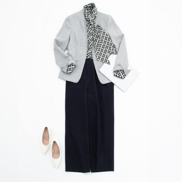 スーツのジャケットを単品で活用し、ネイビーのワイドパンツを合わせた「ジャケパン」スタイル。幾何学模様のボウタイブラウスが視線を集め、こなれた知性を演出します。セットアップよりも少しリラックスした表情で、社内ミーティングに最適です。