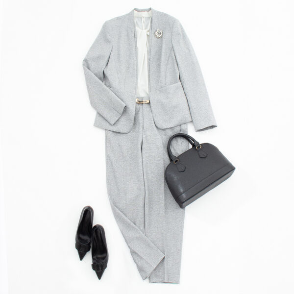 グレーのカラーレスジャケットと共布のパンツを合わせた、凛とした佇まいのセットアップ。