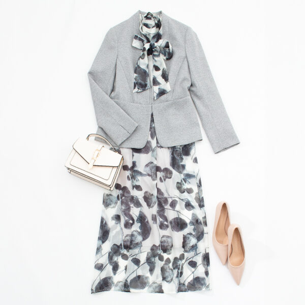 華やかなプリントワンピースにジャケットをさらりと羽織ったアレンジ。シャープなVラインのジャケットが甘さを抑え、洗練された大人のレセプションスタイルへと導きます。バッグに「白」を取り入れることで、春のお祝いムードをより一層明るく引き立てて。