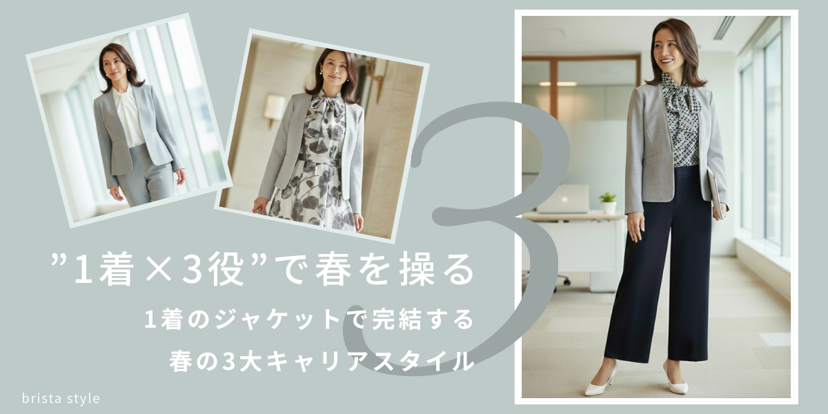 今回は、1着のグレーパンツスーツを軸に、春の主要なビジネスシーンを鮮やかに彩る着回し術をご紹介します。