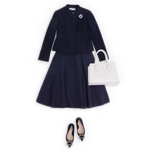 コーディネートに悩まない華やかなツイード素材のスカートスーツ。きちんと感のあるスーツスタイルは、どのようなセレモニーの会場にも馴染む王道アイテムです。無難な黒ではないオフホワイトのバッグとネイビーの靴が、今どきで程よく抜けたスタイルへと導いてくれます。