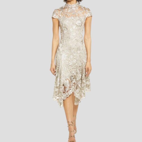 デコルテから胸元にかけての透け感のあるレースデザインがフェミニンな魅力を引き立て、アシンメトリーなヘムラインが個性的な装いを完成させます。