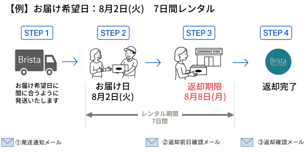 2. 返却日前日確認メール:商品の返却日前日に、返却日の確認メールをお送りいたします。