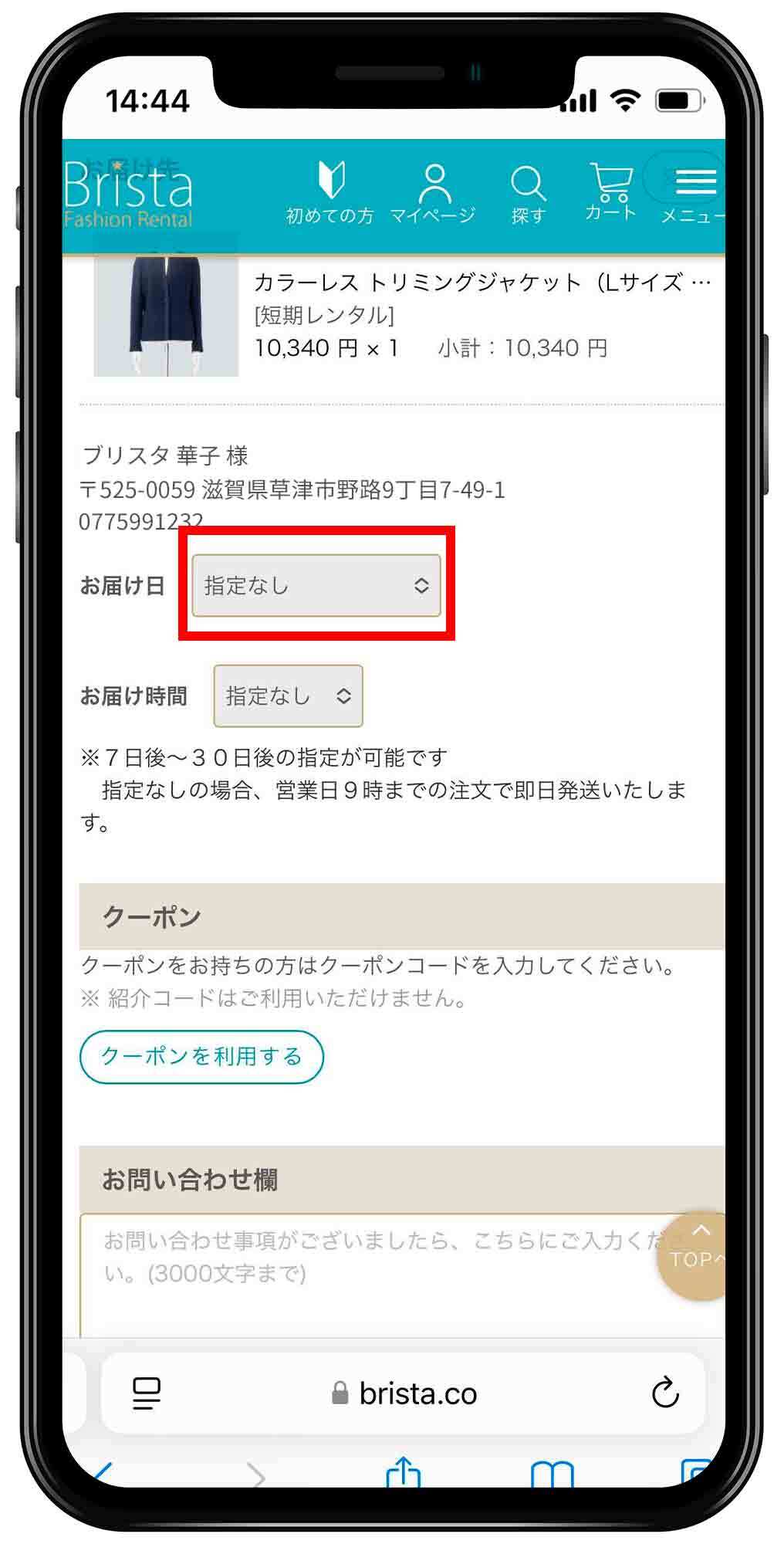 注文時、[お問い合わせ欄]に商品到着希望日をご記載ください。